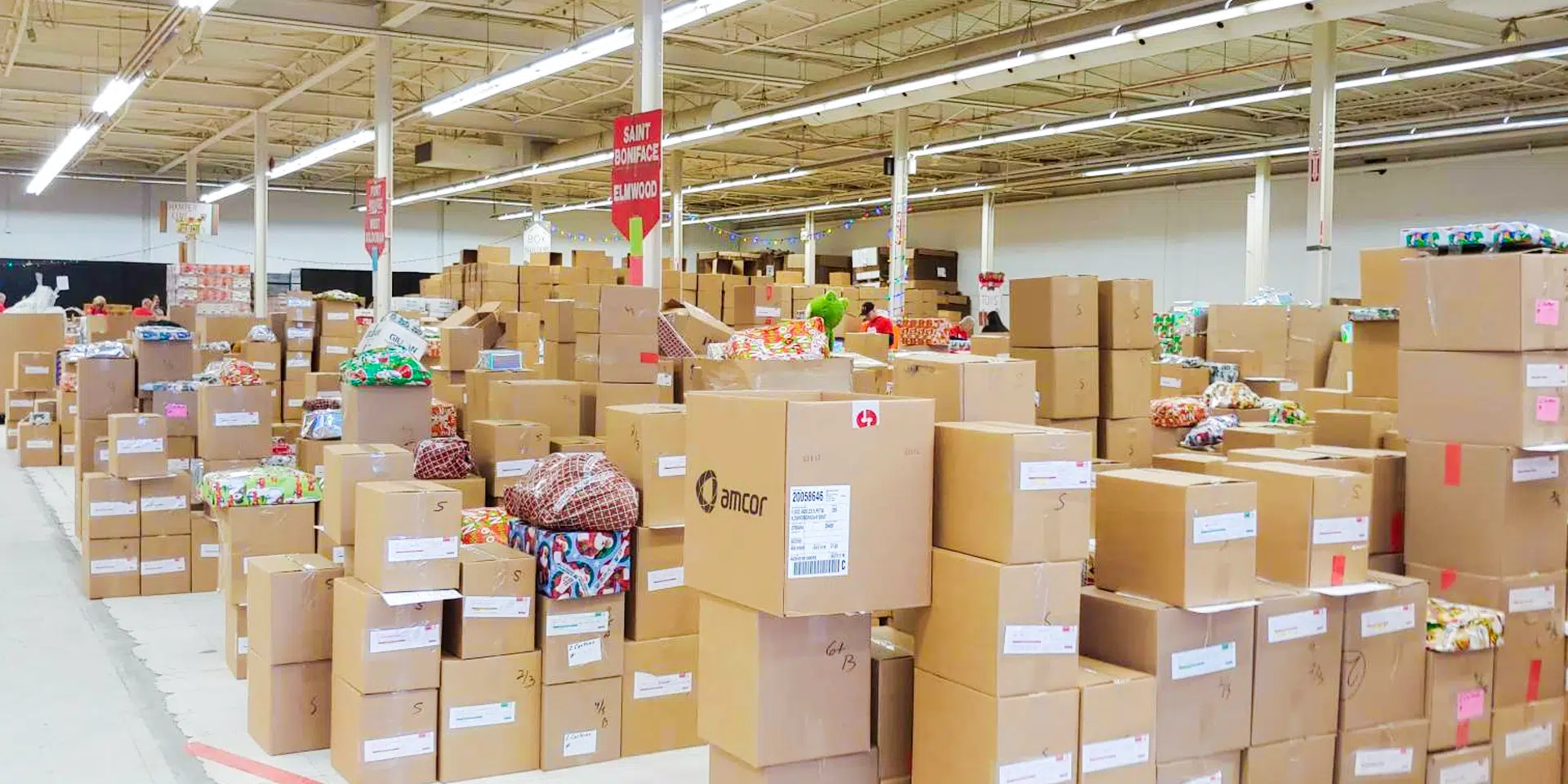 Christmas Cheer Board warehouse in Winnipeg, with boxes and wrapped gifts stacked up, ready for delivery to Saint Boniface and Elmwood.